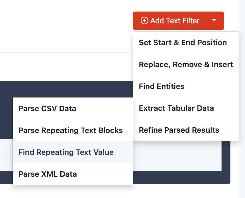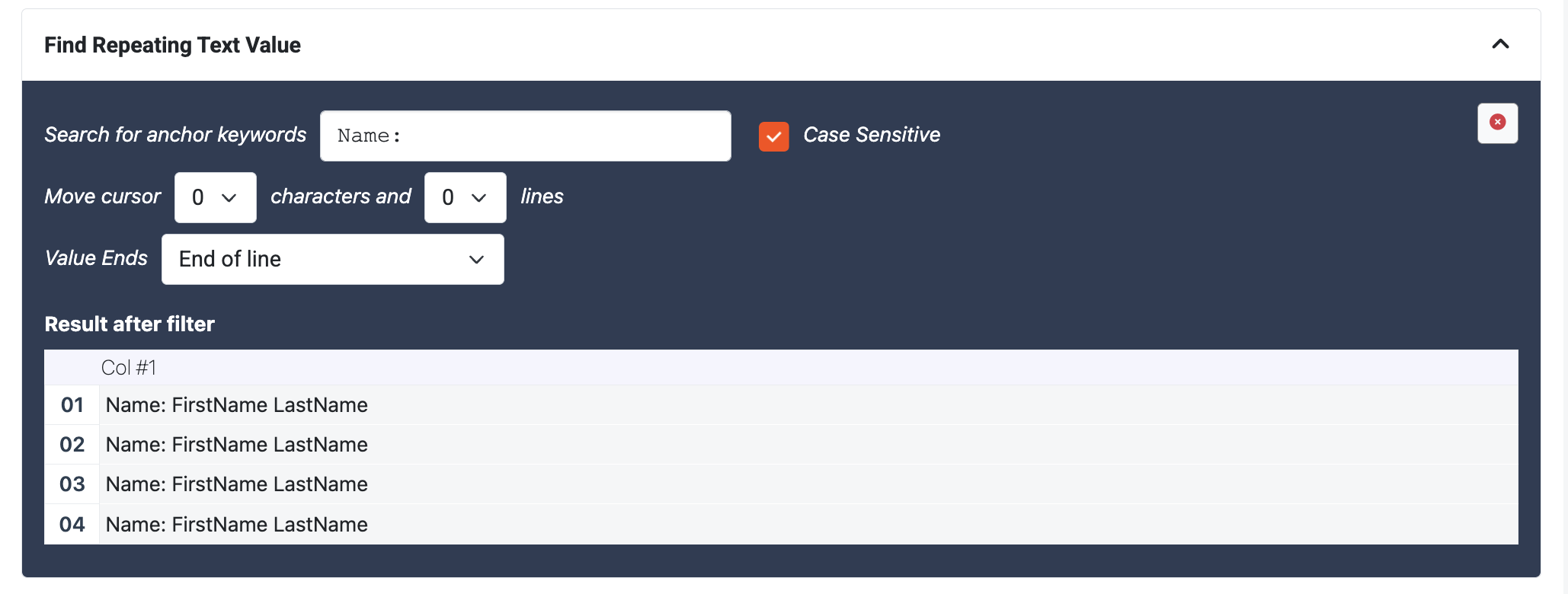 The Find Repeating Text Values filter helps you extract multiple values from an email by using a repeating keyword as a reference point.