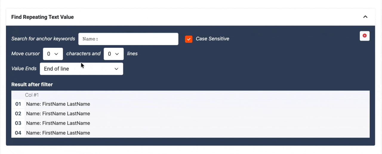 The filter extracts values based on their position relative to a repeating keyword (anchor). Each time the keyword appears, Mailparser captures the associated value.